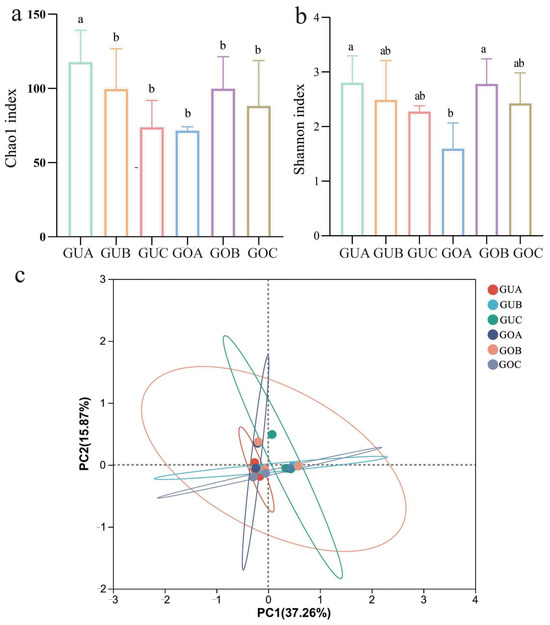 Analysis of fungal diversity and community in the flower of C. praecox in different blooming stages and under different circadian rhythms. (a) Chao1 index; (b) Shannon index; (c) fungal community. GUA: unopened flowers at 7:00 a.m.; GUB: unopened flowers at 1:00 p.m.; GUC: unopened flowers at 7:00 p.m.; GOA: opened flowers at 7:00 a.m.; GOB: opened flowers at 1:00 p.m.; GOC: opened flowers at 7:00 p.m.. Different letters in each column indicate significant differences (p < 0.05).