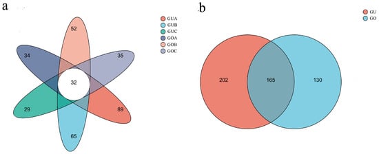 Venn analysis for the OTU distribution of endophytic fungi. (a,b) indicate the different blooming stages and circadian rhythms, respectively. GUA: unopened flowers at 7:00 a.m.; GUB: unopened flowers at 1:00 p.m.; GUC: unopened flowers at 7:00 p.m.; GOA: opened flowers at 7:00 a.m.; GOB: opened flowers at 1:00 p.m.; GOC: opened flowers at 7:00 p.m..