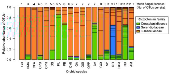 Rhizoctonian OTU diversity and relative frequencies of reads among the 19 studied orchid species. The numbers above the barplots indicate the mean fungal richness per site and orchid species. Rhizoctonian families are colour-coded: Ceratobasidiaceae (in green), Serendipitaceae (in blue) and Tulasnellaceae (in orange). Orchid species: Anacamptis morio (AM), A. pyramidalis (AP), Dactylorhiza sambucina (DS), D. viridis (DV), Gymnadenia conopsea diploid (GCd), G. conopsea tetraploid (GCt), G. densiflora (GD), Neottia ovata (NO), Neotinea ustulata (NU), Ophrys apifera (OPA), Op. holubyana (OPH), Op. sphegodes subsp. passionis (OPP), Orchis anthropophora (OA), O. mascula (OMA), O. militaris (OMI), O. purpurea (OPU), O. simia (OSI), Platanthera bifolia (PB) and Platanthera spp. (PL).