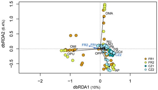 Distance-based redundance analysis comparing the fungal communities in plants of 11 orchid species that occurred at least in two sites. The circles in the diagram represent plants from different orchid species, while the arrows depict explanatory variables: locality (in blue) and orchid host identity (in black). The sites are represented by colours: French sites FR1 (brown) and FR2 (light green), Czech sites CZ1 (dark blue) and CZ2 (light blue). Orchid species: Anacamptis morio (AM); A. pyramidalis (AP); Dactylorhiza sambucina (DS); Gymnadenia conopsea diploid (GCd); Ophrys sphegodes subsp. passionis (OPP); Orchis mascula (OMA); O. militaris (OMI); O. purpurea (OPU); Neottia ovata (NO); Neotinea ustulata (NU); and Platanthera bifolia (PB).