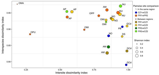 Diversity and dissimilarity indices in OMF community composition of 11 orchid species occurring at multiple sites. The X-axis represents intersite dissimilarity indices within the same orchid species across different occurrence sites. The Y-axis illustrates interspecies dissimilarity indices between various orchid species coexisting within the same site. Each circle symbolizes a pairwise comparison of fungal dissimilarity indices in the same orchid species at two sites, denoted by the colour of circles, either within or between regions. The size of each circle is proportional to the mean Shannon diversity index of the orchid species at both sites. Orchid species include Anacamptis morio (AM); A. pyramidalis (AP); Dactylorhiza sambucina (DS); Gymnadenia conopsea diploid (GCd); Neottia ovata (NO); Neotinea ustulata (NU); Ophrys sphegodes subsp. passionis (OPP); Orchis mascula (OMA); O. militaris (OMI); O. purpurea (OPU); and Platanthera bifolia (PB).