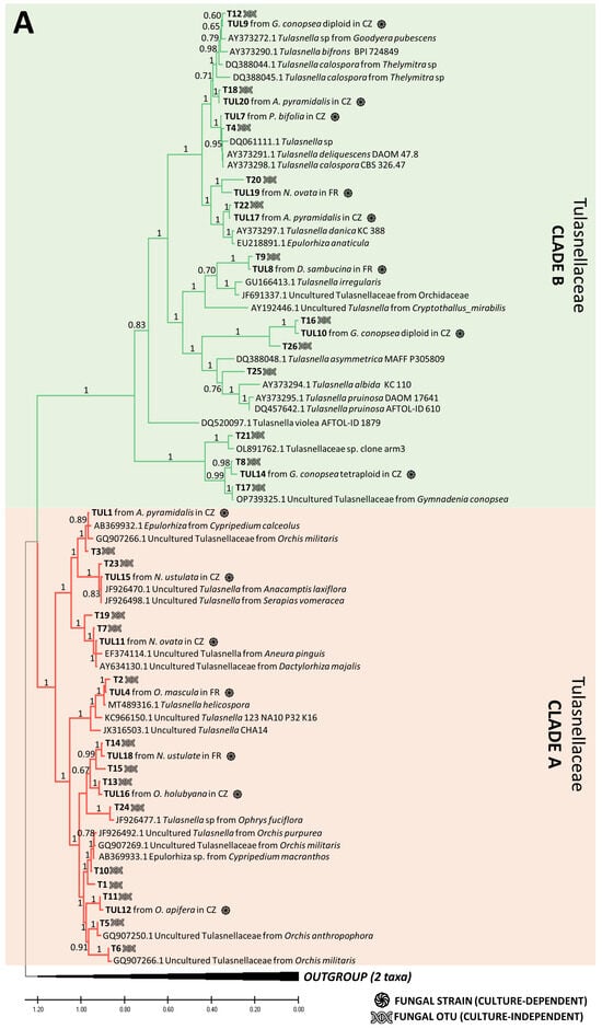 Phylogenetic trees combining the fungal OTUs obtained by culture-dependent and -independent methods. Rhizoctonian families include Tulasnellaceae (two lineages, clades A (red section) and B (green section)) (A), Ceratobasidiaceae (B) and Sebacinales order (two families, Serendipitaceae (orange section) and Sebacinaceae (blue section)) (C). In the illustration, the symbol of DNA helix refers to the fungal OTUs obtained with NGS method, while the black circle represents the fungal OTUs cultivated from pelotons. Additional information on fungal strains includes details about the orchid host and the site of occurrence, indicated as France (FR) or the Czech Republic (CZ) within the tree. Orchid species include Anacamptis morio; A. pyramidalis; Dactylorhiza sambucina; D. viridis; D. majalis; Gymnadenia conopsea diploid; G. conopsea tetraploid; Neottia ovata; Neotinea ustulata; Ophrys apifera; Op. holubyana; Op. sphegodes subsp. passionis; Orchis mascula; and Platanthera bifolia.