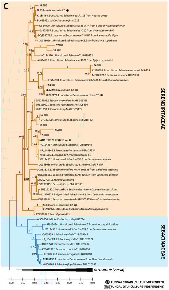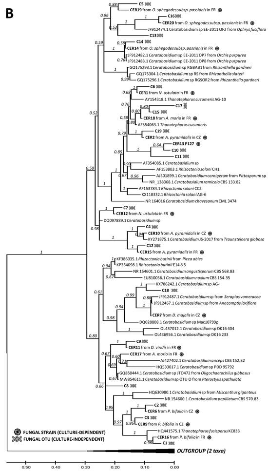 Sequences obtained from NGS, and fungal isolates were utilized to identify their closest counterparts in the National Center for Biotechnology Information (NCBI) GenBank database (www.ncbi.nlm.nih.gov/genbank; accessed on 30 August 2023) with a high similarity threshold (≥97%). The sequences of Saitozyma pseudoflava (MK050284.1) and Trichosporon sp. (DQ288848.2) were designated as outgroup taxa. Phylogenetic analyses were performed separately for each rhizoctonian family (i.e., Tulasnellaceae, Ceratobasidiaceae and Serendipitaceae). Multiple sequence alignments were generated using MAFFT v7.310 with the L-INS-i strategy [43]. Alignments were then visualized and manually trimmed using BioEdit Sequence Alignment Editor [44] to ensure the best common coverage after alignment. The optimum nucleotide substitution model was determined using the jModelTest2 v.2.1.6 on XSEDE [45] based on the Akaike and Bayesian information criteria (AIC and BIC). Phylogenetic trees were then constructed using Bayesian inference (BI). The BI analysis was performed using MrBayes on XSEDE v.3.2.7a [46] through the CIPRES Science Gateway V.3.3 (phylo.org) [47]. The selected optimal model was the gamma distribution with invariant sites (GTR+I+G) model, and Bayesian posterior probabilities (PP) were obtained from the 50% majority-rule consensus of the retained trees. The tree topologies were visualized in FigTree v1.4.4 [48] and edited using MEGA v11 [49].
