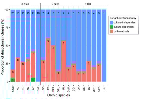 When comparing both approaches, the culture-independent method identified a greater overall rhizoctonia richness (number of fungal OTUs per orchid species) than the culture-dependent one. On average, 26.3% of fungal OTUs were detected simultaneously by both techniques, while culture-independent and -dependent techniques alone yielded 73.2% and 0.5% of OTUs, respectively (Figure 5).