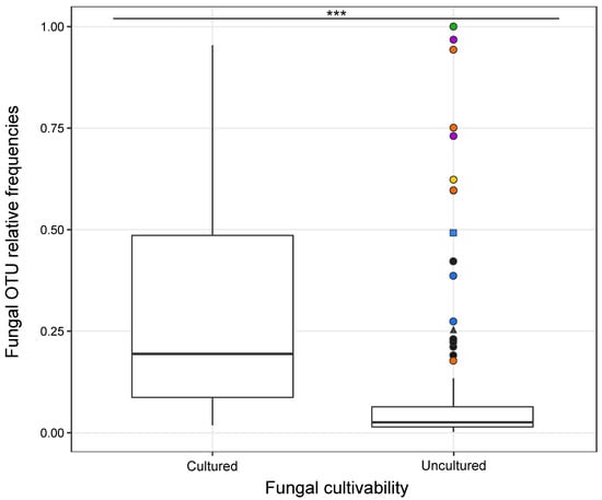 Mean relative frequencies of sequence reads of rhizoctonian fungal OTUs categorized by their cultivability under laboratory conditions (‘cultured’ or ‘uncultured’). The box plots represent median, upper and lower quartiles with the whiskers showing minimum and maximum values, outliers as circles. Different colours and symbols denote abundant OTUs that failed in cultivation from some orchid hosts: Gymnadenia densiflora (in green); Orchis purpurea (in purple); O. militaris (in orange); O. anthropophora (in yellow); Dactylorhiza sambucina (in blue); and other species (in black). The symbols indicate the fungal family: circle, square and triangle for Tulasnellaceae, Ceratobasidiaceae and Serendipitaceae OTUs, respectively. The symbol (***) indicates a significant difference in the relative frequencies of fungal OTUs between the cultivability status (‘cultured’ versus ‘uncultured’) of the strains, with p values ≤ 0.001 based on ANOVA test.