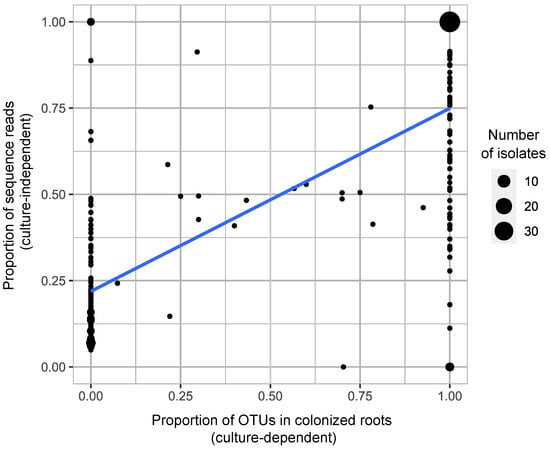Correlation between the relative frequencies of sequence reads of the cultivable OTUs and their proportion in corresponding mycorrhizal roots. Each dot represents a cultivable OTU’s isolate detected through both culture-dependent and -independent methods across a total of 108 plants. The circles are proportional to the number of isolates. The blue line corresponds to the linear regression model.
