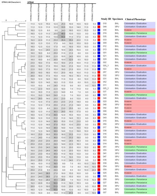 The STRAf strain typing detected 45 genotypes among the 53 isolates (52 patients). The M3 marker combination displayed the highest discriminatory power, with M4 displaying the lowest (Table S3). The discriminatory power using both M2 and M3 marker sets was comparable to using a combination of M2, M3 and M4 (Table S3).