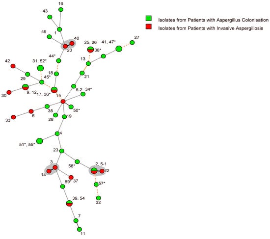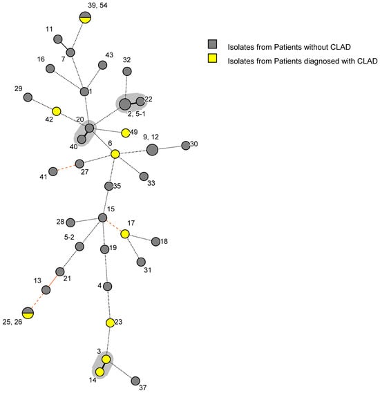 Minimum spanning tree (MST) Displaying the Genetic Relatedness between Aspergillus fumigatus Isolates and a Chronic Lung Allograft Dysfunction Diagnosis in the 12 months after A. fumigatus Isolation in Lung Transplant Recipients. The minimum spanning tree visually estimates the relationships between the different genotypes. The greater the distance between genotypes, the greater the dissimilarity. Tracheobronchitis and bronchial anastomotic infections are classified as invasive aspergillosis [39]. Circles represent different STRAf genotypes, with the size representing the number of isolates belonging to each genotype. Numbers refer to the study number of each isolate, with the preceding number (in shared genotypes) belonging to the lower portions of divided circles. Connecting lines indicate the similarity between STR genotypes: thick solid black lines indicate a difference of 1 STR locus (defined as a cluster), thin solid black lines—2 STR loci (defined as related), solid orange lines—3 STR loci (defined as unrelated), dashed orange lines—4 STR loci (defined as unrelated,) and dotted black lines—5 or more STR loci differences (defined as unrelated). Grey shaded backgrounds represent a cluster.