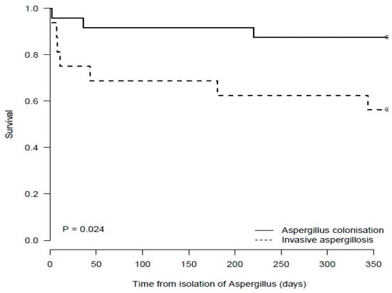 Bacterial infections were frequent and the most common type of co-infection (Table S2). There was no significant difference in the infection rates in relation to the timing of A. fumigatus isolation; however, a trend toward a greater incidence of CMV reactivation after A. fumigatus isolation was observed (0 vs. 5; p = 0.06) (Table S2).