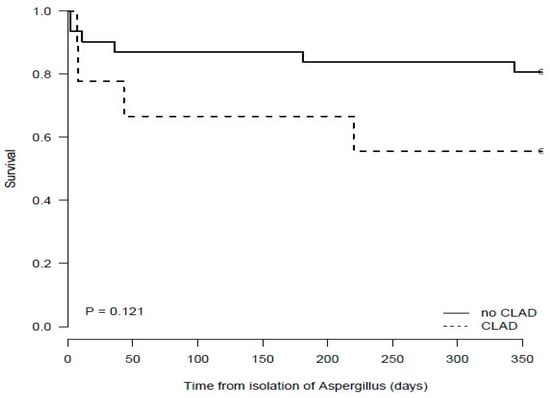 The median (IQR) time to death from index A. fumigatus isolation in colonised patients was 110 days (10.5–211) and was not significantly longer than in IA patients (11 days (7–181)) (p = 0.69). Survival was significantly lower in LTx patients who had IA as compared with those patients who were colonised (p = 0.024) (Figure 4). In addition, in those that isolated A. fumigatus, a trend towards lower survival was seen in LTx patients who had CLAD as compared with those who did not have CLAD (p = 0.121) (Figure 5).