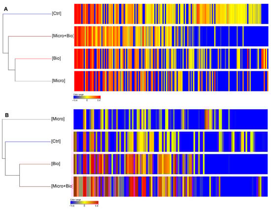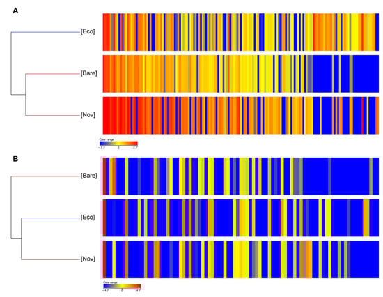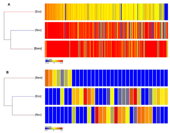 Heat maps and dendrograms obtained by comparing the differential metabolomic profiles of tomato leaves cultivated on mulch biofilms and upon treatments with the combination of both biostimulants, compared to plants cultivated on bare soil and treated with the combination of both biostimulants. The range of colours from blue to red shows how the intensities of the different compounds vary from the least abundant to the most abundant, respectively. (A) Differential metabolomic profiles obtained in positive ionization mode (ESI+). (B) Differential metabolomic profiles obtained in negative ionization mode (ESI−). Each column represents a metabolite, while data for each treatment is presented in rows. The heat map was developed using MassProfiler Professional bioinformatics software (Agilent Technologies) and statistical differences were determined by one-way ANOVA test (p < 0.05).