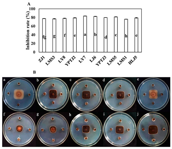 17], with the center of the dish used as the center point cross and vertical cross in the sterile Oxford cup at four points 30 mm away from the center, 10 mL of PDA medium was poured into the Oxford cup for solidification. Endophytic bacterial liquid (100 μL) was injected into the centers of four Oxford cups with 5 mm diameter phytopathogenic fungus spots. The cups were then placed in a 25 °C-constant temperature incubator. Phytopathogenic fungus alone was used as a control. When the diameter of the control pathogen colonies reached approximately 6 cm, the pathogen colony diameter and inhibitory zone under all treatments were measured using Vernier calipers. The inhibitory rate was calculated using Equation (1) as follows: