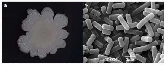 18], the supernatant was discarded, and the precipitation was left in the pipe according to the volume ratio of 1:20. The fixative glutaraldehyde was added, mixed well, and then poured into a 2 mL centrifuge tube at 4 °C and 10,000 rpm for 10 min. The supernatant was removed, the bacteria were collected, and a PBS buffer with pH 7.4 and a concentration of 0.1 mol/L was added to shake and rinse twice for 10 min each time. The bacteria were evenly coated on the cover glass and dehydrated in a series of ethanol solutions at concentrations of 30%, 50%, 70%, 80%, 90%, and 100% for 10 min each, and finally dehydrated with tert-butanol for 10 min. After drying, the gold spraying was performed. Finally, the morphology and size of the LY7 bacteria were observed using scanning electron microscopy (SEM, JSM-6490LV, Nippon Electronics Co., Ltd., Tokyo, Japan).