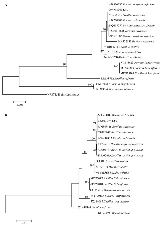 https://blast.ncbi.nlm.nih.gov/Blast.cgi, accessed on 20 March 2022). Related sequences with high similarity were selected, and a phylogenetic tree was constructed using MEGA version 7 (Mega Limited, Auckland, New Zealand) to clarify the classification status of strain LY7.