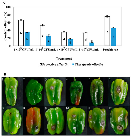 Bell peppers of the same size and maturity stage were cleaned with sterile water and disinfected with 75% alcohol three times. After their surfaces were dried, they were placed in sterilized disposable boxes. Fruit wounds were made through sterile inoculation, and 5-mm C. scovillei spots were prepared for wound inoculation. LY7 suspensions of 1 × 106, 1 × 107, 1 × 108, and 1 × 109 CFU/mL were prepared, and 450 g/L of 600× diluted prochloraz and sterile water were used as the positive and blank controls, respectively.