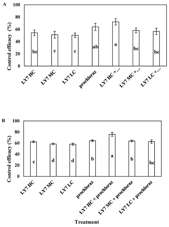 8 CFU/mL LY7 suspension mixed with prochloraz and applied in 2022 was significantly more effective than prochloraz alone. Previous reports have indicated that the protective effect of biocontrol bacteria exceeds their therapeutic effect because inoculation of bacteria with a strong colonization ability can contribute to disease control [