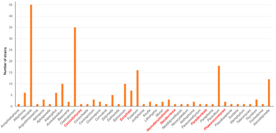 Figure 1 shows the relative abundance (based on the number of strains) of the genera recovered from the samples. Alternaria (45) was the most abundant, followed by Cladosporium 35), Penicillium (18), Fusarium (15), Xenodidymella (12), Aureobasidium (10), and Epicoccum (10). Several genera had only one strain, i.e., Angustimassarina, Apiospora, Beauveria, Coniochaeta, Cosmospora, Dothiorella, Juxtiphoma, Neodidymelliopsis, Paraconiothyrium, Paraphoma, and Pseudoseptoria. Additionally, we isolated several previously unknown species belonging to the genera Exophiala, Neocatenulostroma, Neodevriesia, Paradevriesia, and Phaeococcomyces ([90]) (Figure 1, written in red), as well as the new genus Coccodomyces; all of them were isolated from Els Pallaresos and are suggested here as new taxa.
