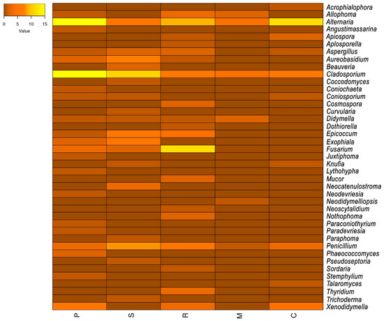 Heatmap showing the relative abundance and distribution of fungal genera among studied sites. (P, Els Pallaresos, urban area; S, Els Pallaresos, industrial area; R, Reus; M, Montbrió del Camp; C, Calafell).
