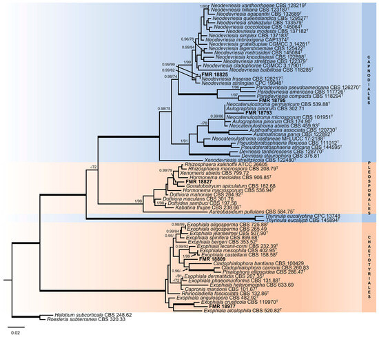 It is important to mention that the rpb2 locus was not always correctly amplified. The general LSU phylogenetic tree (Figure 3), based on 899 positions including gaps, confirmed that our strains FMR 18793, FMR 18795, and FMR 18825 belonged to the order Capnodiales, while FMR 18977 and FMR 18809 were located within the order Chaetotyriales, and FMR 18827 in the order Pleosporales, all of these being considered as potential new taxa.