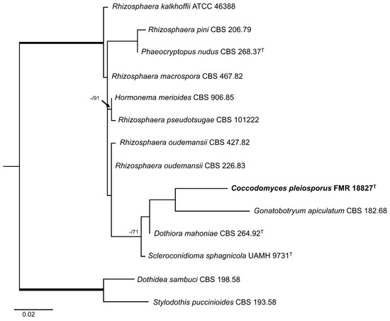 For the strain FMR 18827, the ITS alignment included 12 ingroups and two outgroups (Dothidea sambuci CBS198.58 and Stylodothis pucciniodes CBS 193.58) with a total of 575 characters (including gaps). The BI and ML showed similar topology and congruent results. In the phylogenetic tree (Figure 4) FMR 18827 was located within the order Dothideales, in the same linage (fully supported) as Rhizosphaera spp., Hormonema merioides CBS 906.85, and Phaeocryptopus nudus CBS 268.37, and in the same terminal clade (0.70 PP/71% BS) as Gonatobotryum apiculatum CBS 182.68, Dothiora mahoniae CBS 264.92, and Scleroconidioma sphagnicola UAMH 9731.