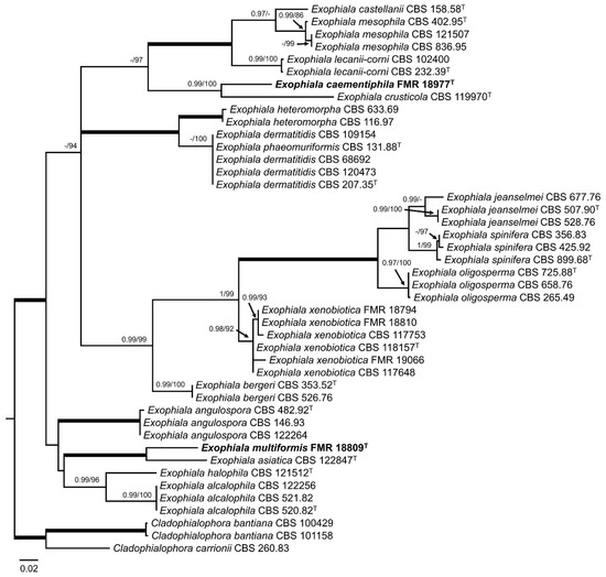 For Exophiala spp., the ITS alignment comprised 41 ingroups and three outgroups (Cladophialophora bantiana CBS 101158 and CBS100429, and Cladophialophora carrioni CBS 260.83) with 586 characters including gaps. The BI and ML showed similar topology and congruent results. In the phylogenetic tree (Figure 5) the strains FMR 18794, FMR 18810, and FMR 19066 were placed in a well-supported (0.98 PP/92% BS) terminal clade corresponding to E. xenobiotica. On the other hand, the strain FMR 18977 was placed in a well-supported (0.99 PP/100% BS) terminal clade together with the type strain of E. crusticola (CBS 119970), but as a different species (BLAST Id = 88%), while the strain FMR 18809 was located in other well-supported (1 PP/100% BS) terminal clade together the type strain of E. asiatica (CBS 122847), but as a different species (BLAST Id = 88%).