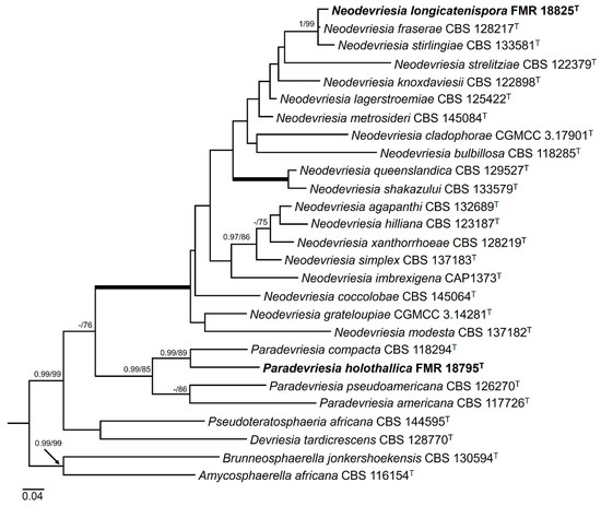 For the genera Neodevriesia and Paradevriesia, the ITS sequence alignment included 25 ingroups and two outgroups (Amycosphaerella africana CBS 116154 and Brunneosphaerella jonkershoekensis CBS 130594) with 514 characters including gaps. The BI analysis showed a similar tree topology and congruent results compared to those obtained in ML. The phylogenetic inference (Figure 6) shows that our strain FMR 18825 forms a well-supported (1 PP/99% BS) terminal clade, together with N. fraserae (CBS 128217) (BLAST Id = 99%) and N. stirlingiae (CBS 133581) (BLAST Id = 98%), within a main fully supported clade corresponding to all species of Neodevriesia. Moreover, the BLAST search for the strain FMR 18825 against N. fraserae and N. stirlingiae indicated a low similarity for tub2 (92% and 90%, respectively) and for rpb2 (94% and 93%, respectively). The main clade corresponding to the species of Paradevriesia (0.99 PP/85% BS) included our strain FMR 18795 (BLAST Id = 92%), which was placed as a different species in a branch (0.99 PP/89% BS) with the type strain of P. compacta.