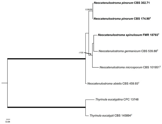 Regarding the genus Neocatenulostroma, the LSU phylogenetic tree (Figure 3) revealed that all species were placed in a well-supported clade (0.99 PP/86% BS), which also included Aulographina pinorum (CBS 174.90 and CBS 302.71) and our strain FMR 18793, with the genus Austroafricana (A. parva and A. associata) as a sister clade, and placed N. castenae (MFLUCC 17-2188) [91] outside these clades. In order to solve the genera and species boundaries, a rpb2 phylogenetic tree was built. The rpb2 alignment comprised eight ingroups with a total of 910 characters, including gaps, and with Thyrinula eucalyptina (CPC 13748) and Thyrinula eucalypti (CBS 145894) as outgroups. The BI and ML showed similar topology and congruent results. The rpb2 phylogenetic tree (Figure 7) confirmed what was observed in the LSU phylogeny: On the one hand, FMR 18793 was placed as a new species of the genus, with N. germanicum as its phylogenetically closest species and together forming a sister clade with N. microsporum. On the other hand, N. pinorum was included in the genus Neocatenulostroma. Because N. castaneae lacks the rpb2 nucleotide sequence, it could not, unfortunately, be included in such phylogenetic analysis.