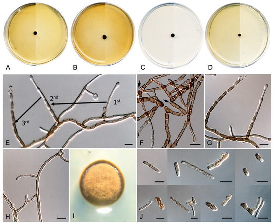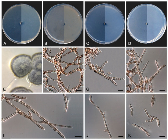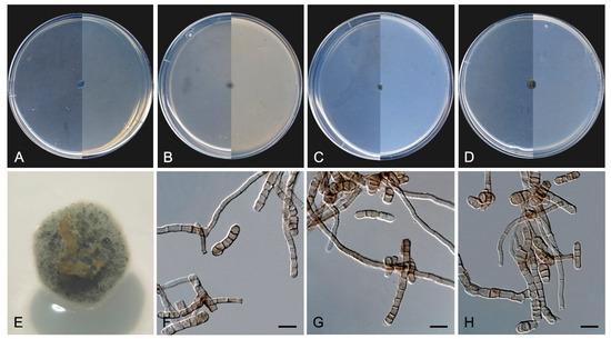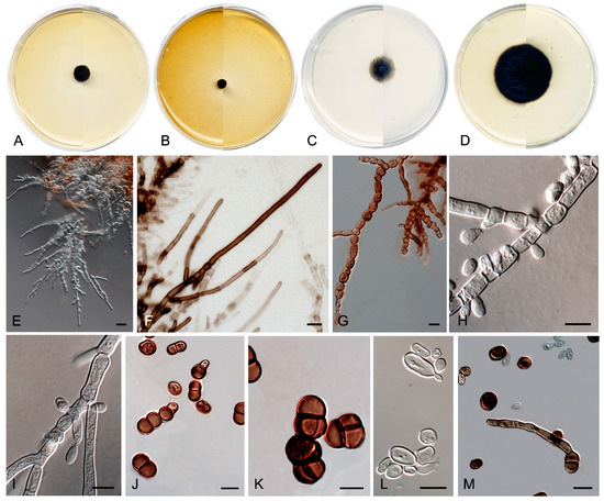 Culture characteristics—(After 14 days at 25 °C, Figure 9A–D) Colonies reaching 3.0 mm diameter on MEA and PCA, 1.5 mm diameter on OA, and 5.0 mm diameter on PDA, circular, margins entire and regular, convex to slightly pulvinate, mucoid at first, soon becoming smooth to verrucose, dry and glistening, cerebriform with age on MEA, OA, and PDA, but mucoid on PCA. Surface and reverse black (6F3) on MEA, OA, and PDA, and black (6F3) with dark brown (6F4) margins on PCA. Minimum, optimum, and maximum temperature of growth: 5 °C, 15−25 °C, and 25 °C, respectively.