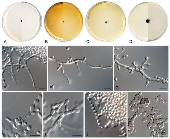 Description—On potato dextrose agar after two weeks at 25 °C—Mycelium scarce, submerged, composed of pale olivaceous-brown to olivaceous-brown, septate, branching, smooth- and thin-walled hyphae, consisting of cylindrical or torulose cells, 2–4 μm wide (Figure 9E). Conidiogenous cells annellidic, mono- to polyblastic, integrated to the hyphae or discrete, then laterally disposed, pale olivaceous-brown to olivaceous-brown, cylindrical, sub-cylindrical, ellipsoidal to broadly ovoid, 4–12 × 2–4 μm (Figure 9F–H). Conidia enteroblastic, non-septate, subhyaline to pale olivaceous-brown, smooth- and thin-walled, cylindrical with rounded ends, ellipsoidal, ovoid to nearly globose, 2–8 × 2–4 μm, often forming chains. Yeast-like cells very abundant, non-septate, subhyaline to olivaceous brown, smooth- and thin-walled, ellipsoidal to ovoid or nearly globose, 2–7 × 2–5 μm, developing secondary conidia to form long chains (Figure 9I–K). Chlamydospores and sexual morph not seen.