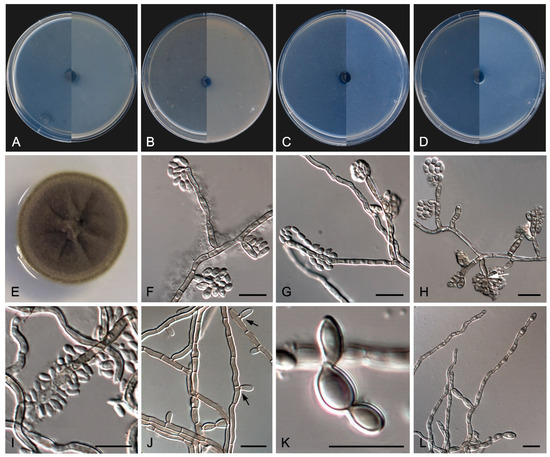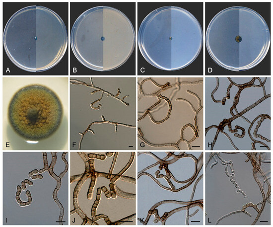 Description—On potato dextrose agar after two weeks at 25 °C—Mycelium composed of septate, hyaline, and thin-walled branching hyphae when young, becoming dark brown, thick-walled, and torulose with age, 4–8 µm wide (Figure 8E–G), ending in terminal aseptate segments of up to 300 µm long (Figure 8F). Hyphae hyaline to copper-brown, guttulate when young, thick-walled when pigmented, composed of cylindrical, subcylindrical to globose cells, 5–20 × 3–7 µm, increasing in the degree of constriction at and the number of transversal septa with age, and then forming additional longitudinal and oblique septa; additional globose cells produced by the blowing-out of the pre-existent cell, giving a granulose look to the hyphae (Figure 8G). Conidiophores absent. Conidiogenous cells integrated to hyphae, smooth or nearly so, thin-walled, prismatic, barrel-shaped, or globose, 5–20 × 3–10 µm, occasionally arising as globose lateral cells, mono- to polyblastic, bearing lateral denticles of 1–3 × 0.5–2 µm (Figure 8H,I). Conidia holoblastic, one-celled, hyaline at first, becoming dark brown with age, produced asynchronously in slimy masses, smooth- and thin- to thick-walled, ellipsoidal to globose, 6–13 × 2–7 µm, covered with a pigmented mucous layer with age and attaching the conidial mass to the hyphae; conidia also developing in new conidiogenous cells producing holoblastic conidia by budding but also forming two-celled conidia by the development of a medial septum which is always constricted due to the swelling of both cells, which also develop in new conidiogenous cells producing inflated, one- or two-celled dark brown conidia, 11–22 × 6–10 µm, disposed in short chains, which can also develop additional longitudinal and oblique septa (Figure 8H–L). Chlamydospores, endoconidia, and sexual morph not seen.