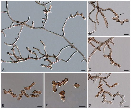 Neocatenulostroma abietis CBS 459.93. (A) Overview of conidiophores arising laterally from the mycelium. (B–D) Macronematous conidiophores with catenated thallic–arthric conidia disarticulated by schizolytic secession (arrows). (E,F) Thallic–arthric multi-septate conidia, with transverse and occasionally oblique septa, catenate, variously shaped, straight, or curved. DIC Nomarski. Scale bars = 10 μm.
