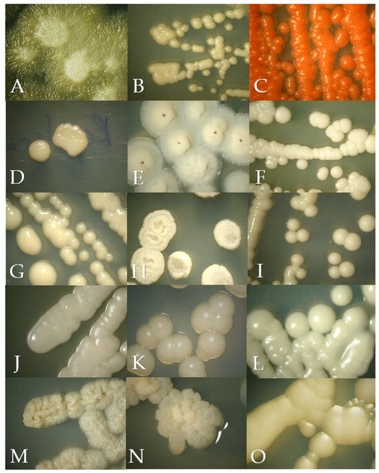 Macroscopic morphology of the isolates in Sabouraud Dextrose Agar after 24 to 72 h of incubation at 28 °C, except for Malassezia pachydermatis incubated at 37 °C. (A) Geotrichum candidum, (B) Cryptococcus neoformans, (C) Rhodotorula mucilaginosa, (D) Prototheca zopfii, (E) Trichosporon asahii, (F) Candida parapsilosis, (G) Nakaseomyces glabrata, (H) Candida tropicalis, (I) Candida albicans, (J) Meyerozyma guilliermondii, (K) Malassezia pachydermatis, (L) Papiliotrema laurentii, (M) Cutaneotrichosporon jirovecii, (N) Trichosporon coremiiforme and (O) Debaryomyces nepalensis.