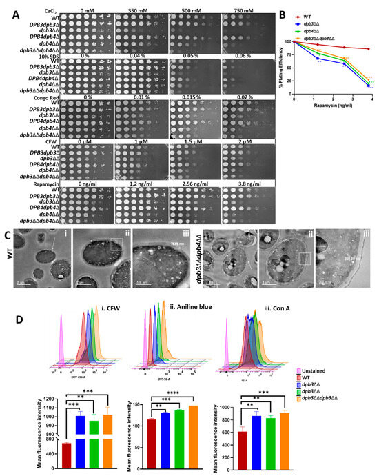 3.5. Multi-Drug Resistance Phenotype of dpb3/dpb4 Null Strains of C. albicans Is Due to Cell Wall Deformity but Independent of Tor1 Signaling