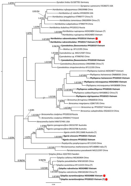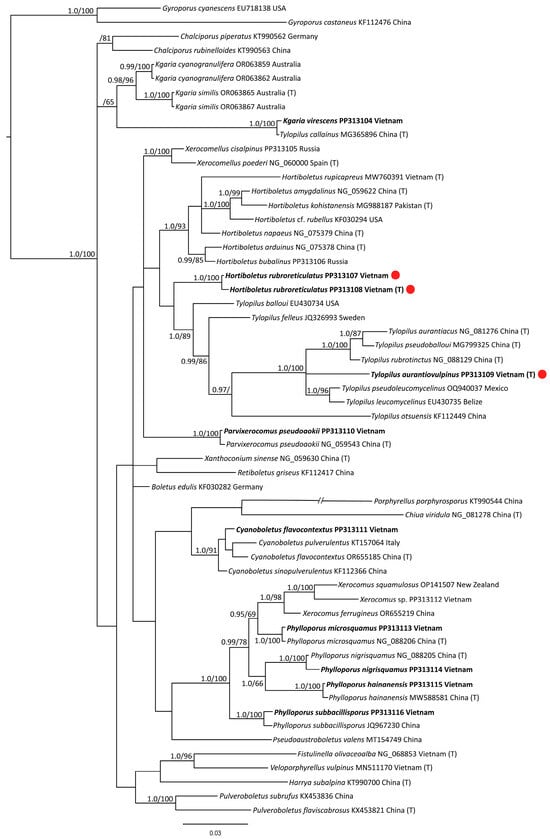 Hortiboletus was established to accommodate Boletus rubellus Krombh. and allied species with smooth spores as opposed to the closely related genus Xerocomellus that includes species with striate spores. The species were also characterized by the common occurrence of small red dots in the context at the stipe base, the average spore quotient (Qm) lower than 2.5, and its habitat in the park, gardens, and other ruderal places. With the inclusion of several new species, the genus concept expanded, including species without red dots, with much longer and narrower spores, and with a wider ecological range. According to Wu et al. [], this genus differs from other genera of Boletaceae by a combination of the dry and subtomentose pileus usually with a wine-red tinge, a yellow–brown to red–brown stipe without a purplish tinge, and a palisadoderm pileipellis composed of vertically arranged, more or less broadened, and often incrusted hyphal elements, with the terminal cells reaching almost the same level. Fourteen species are listed in Index Fungorum (https://www.indexfungorum.org, accessed on 10 February 2024). One species (Hortiboletus rupicapreus Svetash., A.V. Alexandrova, O.V. Morozova & T.H.G. Pham) from Vietnam was recently described [].
