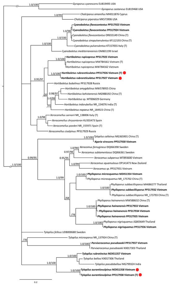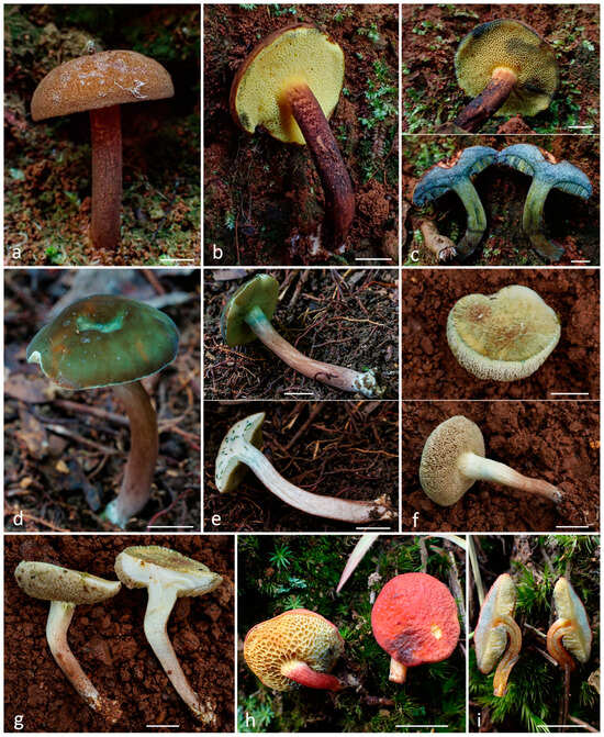 - Zhou, F.; Gao, Y.; Song, H.-Y.; Hu, H.-J.; Yang, W.-J.; Zhang, W.; Liao, L.-Y.; Fang, Y.; Cheng, L.; Hu, D.-M. Phylogenetic and Morphological Evidence Reveal Five New Species of Boletes from Southern China. J. Fungi 2023, 9, 814. [Google Scholar] [CrossRef] [PubMed]