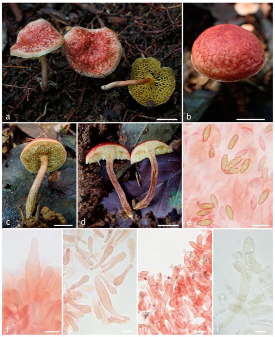 Hortiboletus rubroreticulatus: (a–d) basidiomata; (e) basidiospores; (f) cheilocystidia; (g) basidia and pleurocystidium; (h,i) pileipellis ((a) from LE F-344054, (b–i) from LE F-344053, holotype). Scale bars (a–d) 1 cm, (e–i) 10 μm.