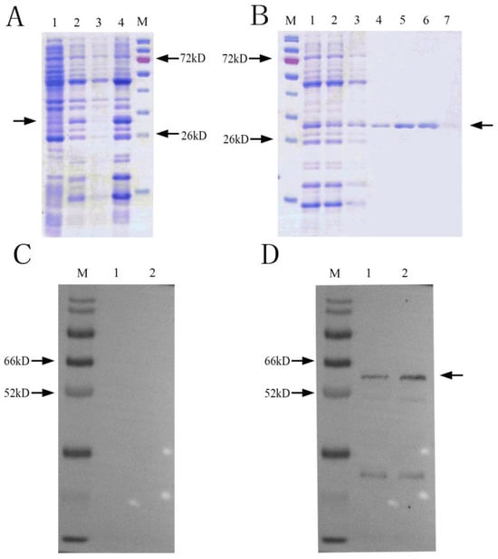 Recombinant protein expression and purification and Western blot analysis: (A) SDS-PAGE of expressed recombinant protein M: protein marker; 1: NbCCTζ-233 total cell lysate (uninduced); 2: NbCCTζ-233 total cell lysate (4 h after induction with 0.5 mM IPTG, 37 °C); 3: ultrasonic supernatant; 4: ultrasonic precipitation; Arrow indicates NbCCTζ-233 protein. (B) protein purification M: protein marker; 1: ultrasonic precipitation with urea solution (sample to be purified); 2: flowthrough; 3: 10 mM imidazole elution; 4: 20 mM imidazole elution; 5: 50 mM imidazole elution 6: 200 mM imidazole elution; 7: 500 mM imidazole elution; Arrow indicates NbCCTζ-233 protein (C) preimmune serum M: protein marker; 1 and 2: total protein of N. bombycis; (D) Western blot of NbCCTζ M: protein marker; 1 and 2: total protein of N. bombycis. Arrow indicates NbCCTζ protein.