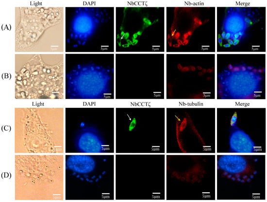 Colocalization analysis of NbCCTζ with Nb-actin and Nbβ-tubulin in the proliferative phase of N. bombycis: (A,C) proliferative phase; (B,D) preimmune serum. The white arrow indicates NbCCTζ; the yellow arrow indicates the Nb-actin or Nbβ-tubulin. The white arrows indicated the green fluorescent signals (NbCCTζ) and the yellow arrows indicated the red fluorescent signals (Nb-actin or Nbβ-tubulin).