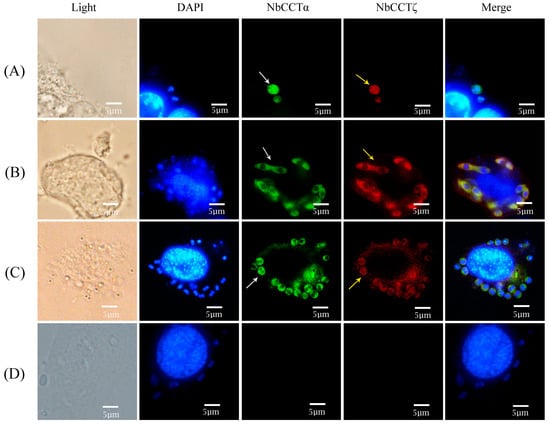 Colocalization analysis of NbCCTζ and NbCCTα in the intracellular stage of N. bombycis: (A) sporoplasm; (B) meront; (C) sporoblast; (D) negative control. The white arrows indicated the green fluorescent signals (NbCCTζ) and the yellow arrows indicated the red fluorescent signals (NbCCTα).