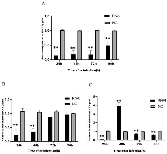 Transcriptional level of NbCCTζ and NbCCTα after RNAi: (A) the relative expression of the NbCCTζ gene after RNAi of NbCCTα. Error bars represent the standard deviation of three independent replicates (n = 3, mean ± SE, ** p < 0.01); (B) the relative expression of the NbCCTζ gene after RNAi of NbCCTζ. Error bars represent the standard deviation of three independent replicates (n = 3, mean ± SE, ** p < 0.01); (C) the relative expression of the NbCCTα gene after the RNAi of NbCCTζ. Error bars represent the standard deviation of three independent replicates (n = 3, mean ± SE, ** p < 0.01).