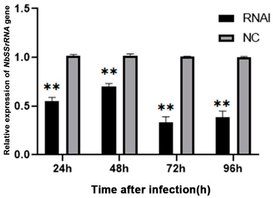Relative expression of NbssrRNA gene after RNAi of NbCCTζ. Error bars represent the standard deviation of three independent replicates (n = 3, mean ± SE, ** p < 0.01).