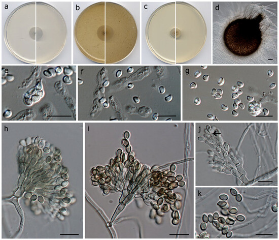 Dactyliodendromyces holomorphus CBS 149968. Colonies on PCA (a), OA (b), and PDA (c) after two weeks at 25 + 1 °C (surface, left; reverse, right); (d) young ascoma; (e) asci; (f) catenated asci; (g) ascospores; (h,i) Conidiophores; (j) Conidiogenous cells, arrow points out annelid’s rings; (k) conidia. Scale bars: (e–k) = 10 µm; (d) = 25 µm.