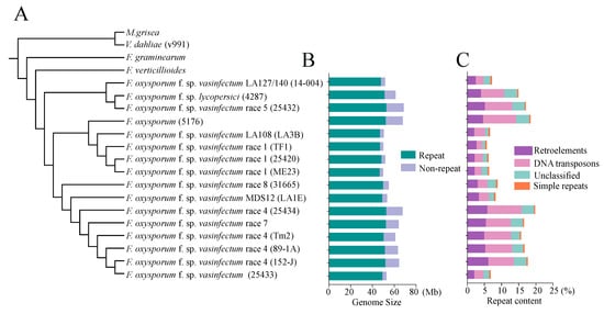 - Jobe, T.O.; Ulloa, M.; Ellis, M.L. A high-quality whole-genome sequence, assembly, and gene annotation of Fusarium oxysporum f. sp. vasinfectum (Fov) race 1 from California. Microbiol. Resour. Announc. 2023, 13, e00702-23. [Google Scholar] [CrossRef]