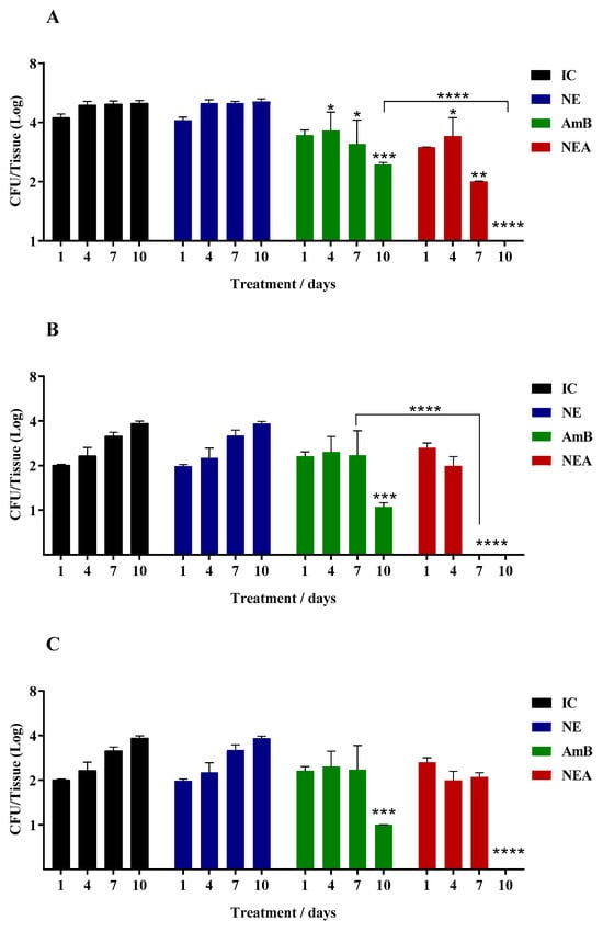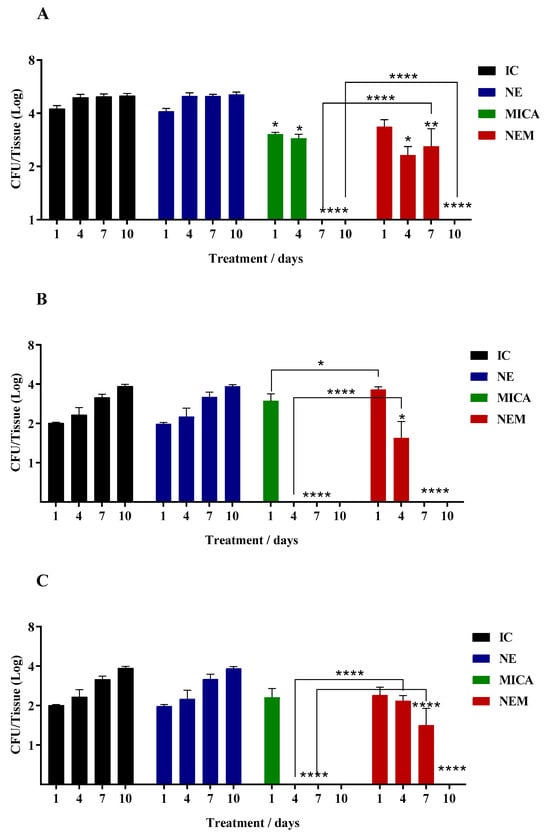 The in vivo assay was approved by the ethics committee for the use of animals at the Faculty of Pharmaceutical Sciences of Araraquara, Brazil (CEUA/FCF/CAr n° 29/2021). The assay was performed as described by Lepak et al. [20] with modifications. In principle, male mice BALB/c mice (8–10 weeks) with a body weight of 25–28 g were kept under supervision and environmentalization in a reversed cycle (12/12 h) for seven days before the start of the experiment, without water and food restrictions. Three days before infection, the mice received a dose of 200 mg/kg of cyclophosphamide (Sigma-Aldrich, North Rhine-Westphalia, Germany) intravenously and 150 mg/kg after one, three, and five days of infection. This regimen made it possible to render the mice leukopenic (absolute white blood cell count, <100 cells/mm3). Mice were infected intraperitoneally with 0.1 mL of sterile saline solution containing 3 × 107 cells/mice. After 4 h of infection, the animals received 0.1 mL of the respective treatments intraperitoneally. The animals were divided into groups of 12 mice to receive the respective treatments and controls: AmB or NEA (0.3 mg/Kg), MICA or NEM (5 mg/Kg), MICAmB or NEMA (0.15 mg/Kg of AmB + 2.5 mg/Kg of MICA), control infection (infection + saline), control without infection (saline only), and control NE (infection + NE). The treatment was carried out every day for 10 days. Between days 1, 4, 7, and 10, three mice/groups were selected for sample collection. The lung, thymus, kidneys, spleen, and liver were collected, washed with saline solution and minced in tubes containing 2 mL of sterile saline until obtaining a homogeneous solution. This solution was cultivated in Sabouraud dextrose agar + chloramphenicol (SDA, BD Difco™, Franklin Lakes, NJ, USA) and incubated at 37 °C for 48 h for quantification of the colony-forming units (CFU/tissue).