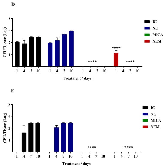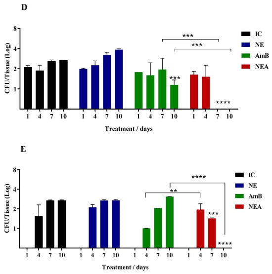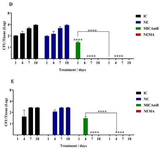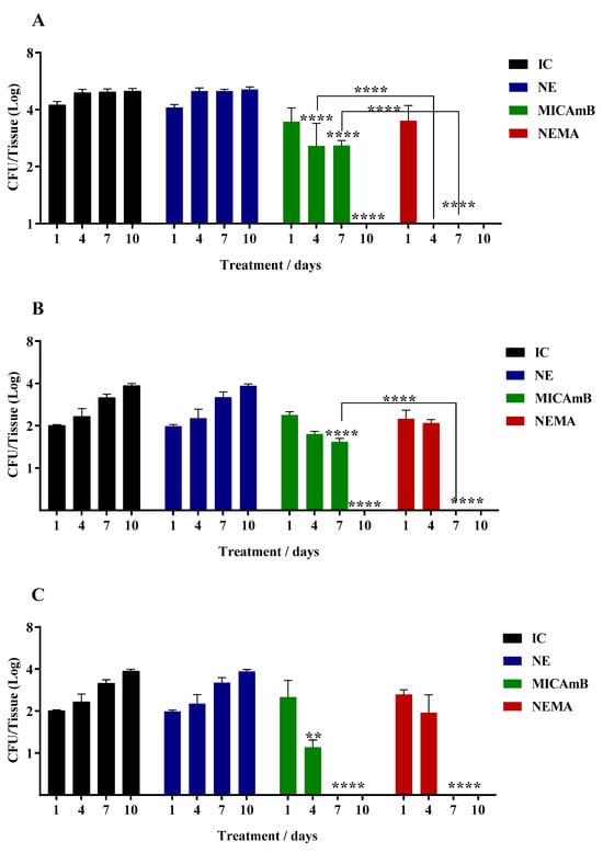 Finally, Figure 3 shows the results obtained during treatment with MICAmB and NEMA; according to the results, the treatment with NEMA was considered the best therapy among the free and encapsulated drugs. NEMA prevented the lung and thymus, organs in the upper region, from being colonized by C. auris; this did not occur in groups treated with MICAmB (Figure 3D,E). Three points need to be highlighted: first, NE loaded with the combined drugs increased the antifungal activity; second, the synergism determined by the checkerboard assay was also confirmed in the in vivo assay. The third observation can be evidenced by the better activity of NEMA when compared to NEA (Figure 1) and NEM (Figure 2). In addition to preventing the yeast from infecting the lung and thymus (Figure 3D,E), NEMA controlled the infection after 4, 7, and 7 days of treatment in the liver, spleen, and kidneys, respectively (Figure 3A–C).