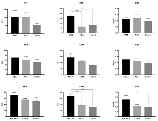Determination of liver and kidney enzyme concentration in infected and treated mice. Legend: GOT: glutamic oxaloacetic transaminase; PGT: glutamic pyruvic transaminase; CRE: creatinine; NEA: nanoemulsion + amphotericin B; NEM: nanoemulsion + micafungin; NEMA: nanoemulsion + micafungin + amphotericin B; AmB: Amphotericin B; MICA: Micafungin; MICAmB: Micafungin + amphotericin B; control: infected mice without treatment; p < 0.05 (*); p < 0.005 (**).
