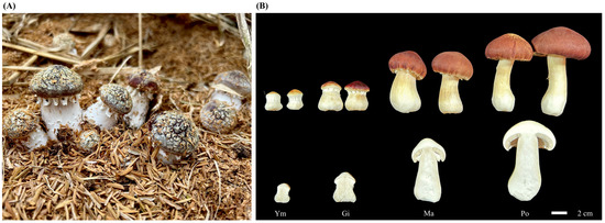 Representative images of S. rugosoannulata fruiting body development. (A) Fruiting body of S. rugosoannulata growing in its controlled environment. (B) Samples collected at different developmental stages for experimental research: Ym, young mushroom stage; Gi, gill stage; Ma, maturation stage; Po, parachute-opening stage.