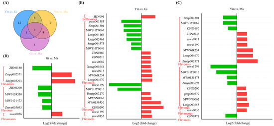 The differential accumulation of flavonoids (DAFs) was assessed using the criteria |log2 (fold change)| ≥ 1 and VIP > 1. As shown in Figure 3A, a total of 33 DAFs were identified across all pairwise comparisons, with flavonols (18, 54.55%) being the predominant category, followed by flavones (10, 30.30%). Notably, kaempferol-3-O-(4″-O-acetyl)rhamnoside and acacetin-7-O-glucoside exhibited differential levels in all pairwise comparisons, indicating their sensitivity to the growth process of S. rugosoannulata. Furthermore, the highest number of DAFs (23) was observed in the Ym vs. Gi comparison, with 14 up-regulated and 9 down-regulated compounds. Ym vs. Ma revealed eleven increased and eight decreased flavonoid compounds, while Gi vs. Ma showed only eight DAFs, suggesting a similarity in flavonoid components between the Gi and Ma stages (Figure 3, Table 1). This suggests that the accumulation of flavonoid compounds in S. rugosoannulata occurs mainly during the early growth stages of its fruiting body. Moreover, the increased levels of flavones and flavonols primarily contribute to the overall rise in total flavonoid content (Table S3).
