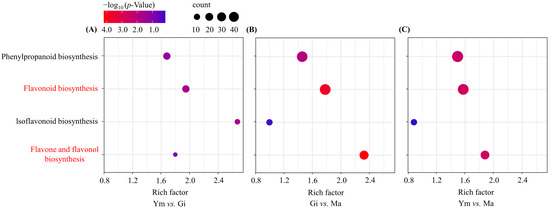 Enrichment analysis of DEGs involved in flavonoid biosynthesis pathway across various sample pairs. (A) Ym vs. Gi; (B) Gi vs. Ma; (C) Ym vs. Ma. Count represents the total number of genes related to the enriched pathway. The rich factor was calculated as the ratio of the number of genes in the pathway entry in the differentially expressed gene to the total number of genes in the pathway entry in all the annotated genes, which indicates the degree of pathway enrichment. Pathways with significant enrichment are shown in red.