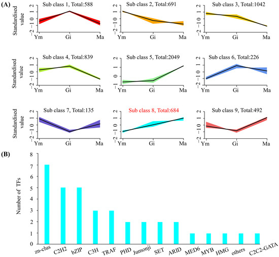 (A) K-means clustering of co-expressed genes and their expression patterns. (B) Transcriptome factors (TFs) involved in cluster 8.